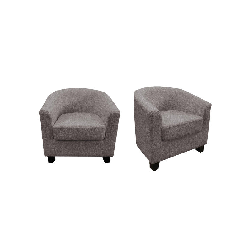 Poltrona Maja struttura in legno, rivestimento in tesssuto bucle. Piedini in legno scuro. Dimensioni 70x63x68 cm. Colore grigio chiaro.