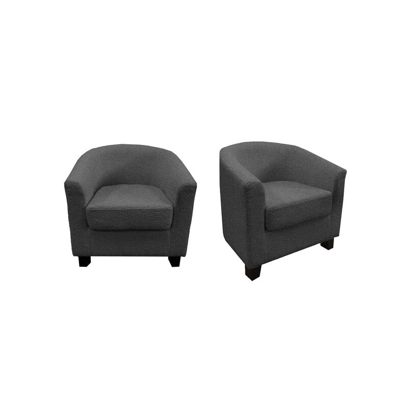 Poltrona Maja struttura in legno, rivestimento in tesssuto bucle. Piedini in legno scuro. Dimensioni 70x63x68 cm. Colore grigio scuro