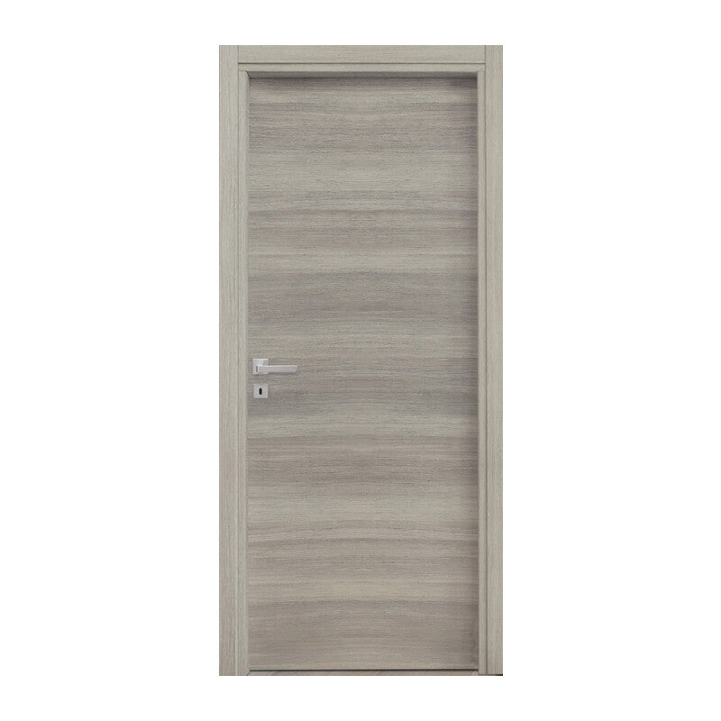 Anta tamburata di spessore nominale 44 mm, riempimento in cartoncino trattato, placcato con pannelli in MDF spessore 3/4 mm nobilitato con carta finish. Telaio piatto in MDF di spessore 40 mm con guarnizione di battuta di gomma. Coprifilo telescopici esterno ed interno in Mdf da 60 mm con aletta utile da 8 mm. Ferramenta serratura mediana. Anuba reversibili. Dimensioni 210x60 cm. Colore rovere grigio