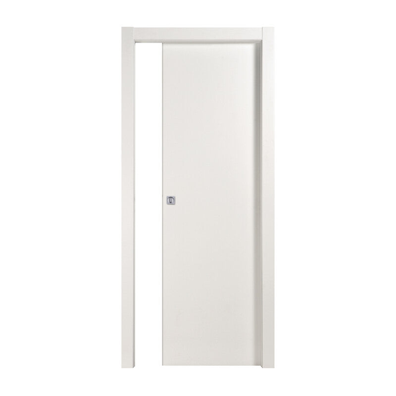 Porta scorrevole interno muro cieca liscia. Telaio perimetrale compreso di rinforzi in massello di abete. Anta spessore 40 mm. Riempimento in cartoncino trattato. Piani in MDF spessore 3.2 mm. Ferramenta (serratura verniciata silver montata). Dotata di apertura scorrevole destra/sinistra, ha unaltezza di 210 cm per una larghezza di 90 cm. Coprifilo esterno ed interno in Mdf da 65 mm spessore10 mm per fasce laterali e spessore 8 mm per fasce trasversali con aletta telescopica Colore bianco