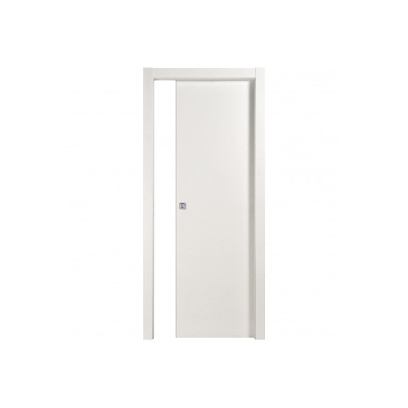 Anta tamburata di spessore nominale 44 mm, riempimento in cartoncino trattato, placcato con pannelli in MDF spessore 3/4 mm nobilitato con carta finish. Telaio piatto in MDF di spessore 40 mm con guarnizione di battuta di gomma. Coprifilo telescopici esterno ed interno in Mdf da 65 mm con aletta utile da 8 mm. Ferramenta serratura. Scorrevole. Dimensioni 210x60 cm. Colore frassino bianco