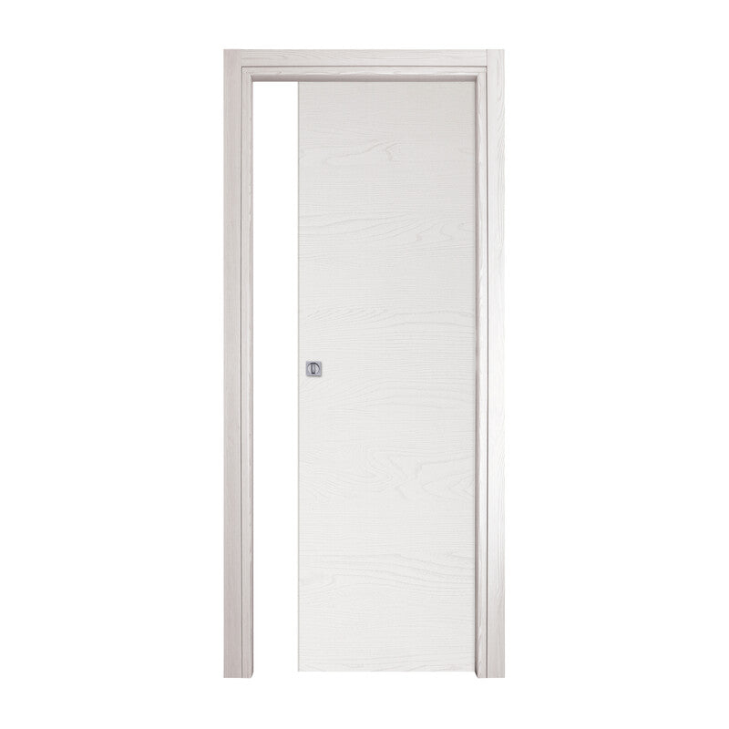 Anta tamburata di spessore nominale 44 mm, riempimento in cartoncino trattato, placcato con pannelli in MDF spessore 3/4 mm nobilitato con carta finish. Telaio piatto in MDF di spessore 40 mm con guarnizione di battuta di gomma. Coprifilo telescopici esterno ed interno in Mdf da 65 mm con aletta utile da 8 mm. Ferramenta serratura. Scorrevole. Dimensioni 210x90 cm. Colore frassino bianco.
