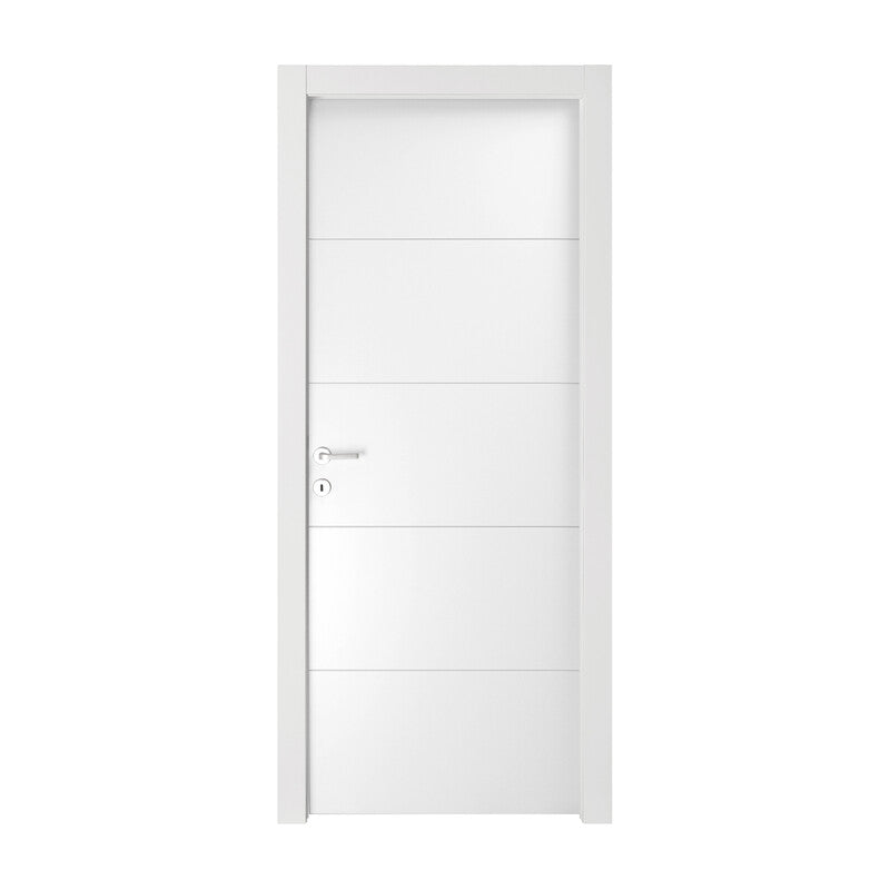 a battente reversibile. Telaio perimetrale compreso di rinforzi in massello di abete. Riempimento in cartoncino trattato. Piani in MDF da 3-4 mm. Bordatura sui 4 lati in carta melaminica neutra. Composta da Anta, Telaio completo di traverso, coprifili. Serratura verniciata silver e cerniere coassiali anuba 13 mm maschio-femmina zincate (montate). Dimensioni 70 x h 210 cm. Finitura bianco laccato.