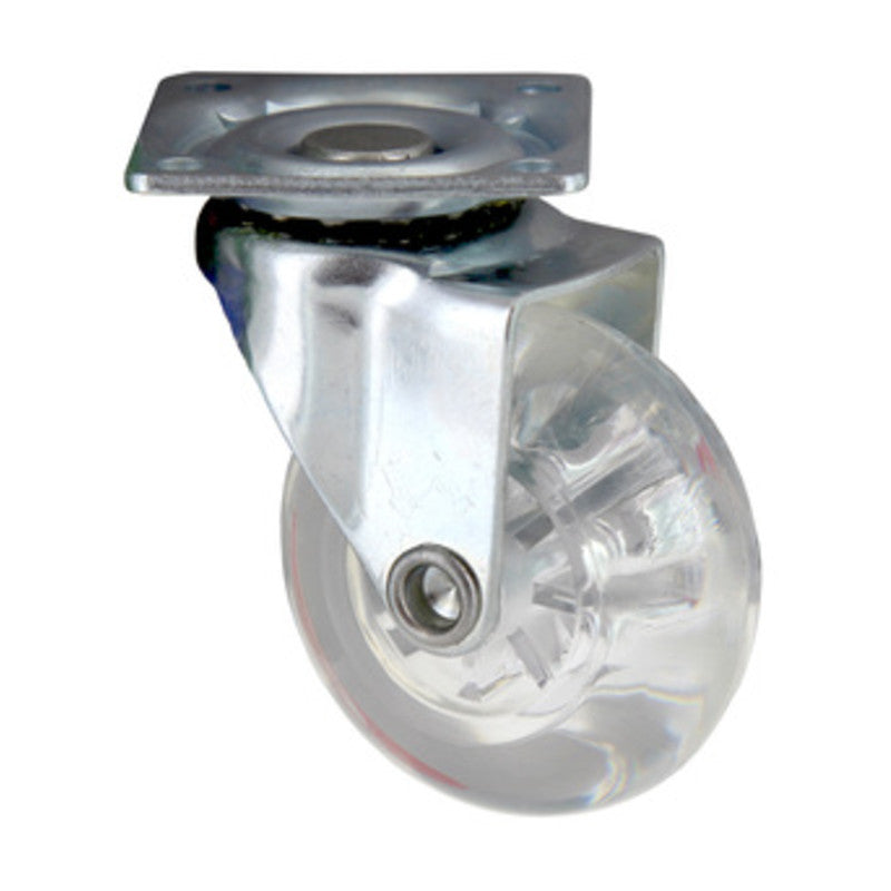 girevole, realizzata in gomma. Supporto in acciaio stampato. Attacco con piastrina quadrata 42 x 42 mm. Ruota trasparente  50 mm. Carico max 40 kg.