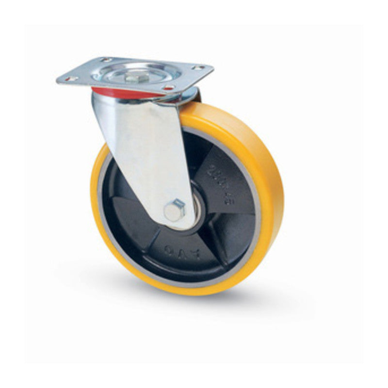 Art. 22brRuota in poliuretano AVOLAN Sh A 91. Nucleo in ghisa meccanica verniciato nero. Mozzo su cuscinetti a sfere schermati con distanziale centrale. Supporti in acciaio stampato con piastra girevole 100 x 85 mm, rotanti su doppia corona di sfere. Dimensioni  100 x 25 x h 128 mm. Portata max 120 kg.