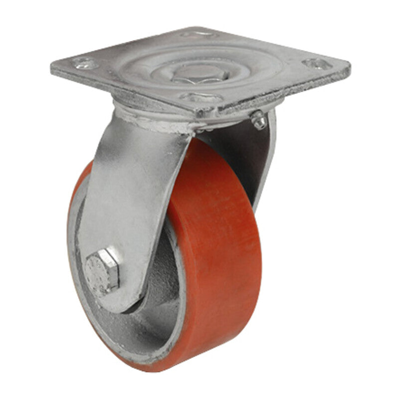 in ghisa rivestita di poliuretano. Supporto in acciaio con piastra girevole 93 x 63 mm. Dimensioni 100 x 32 x h 129 mm. Portata max 130 kg.