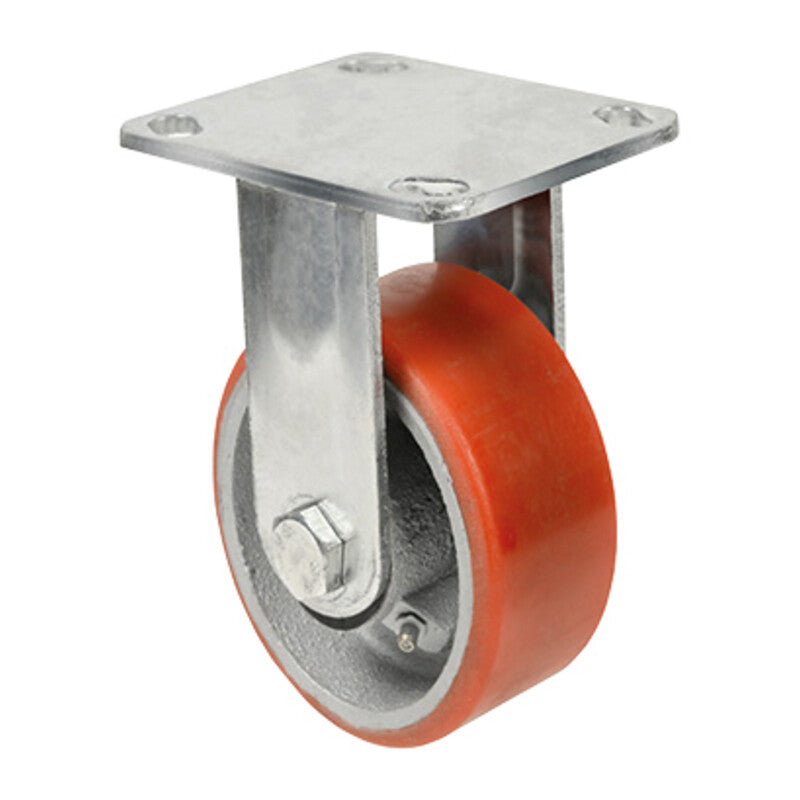 in ghisa rivestita di poliuretano. Supporto in acciaio con piastra fissa 95 x 65 mm. Dimensioni  100 x 32 x h 129 mm. Portata max 130 kg.