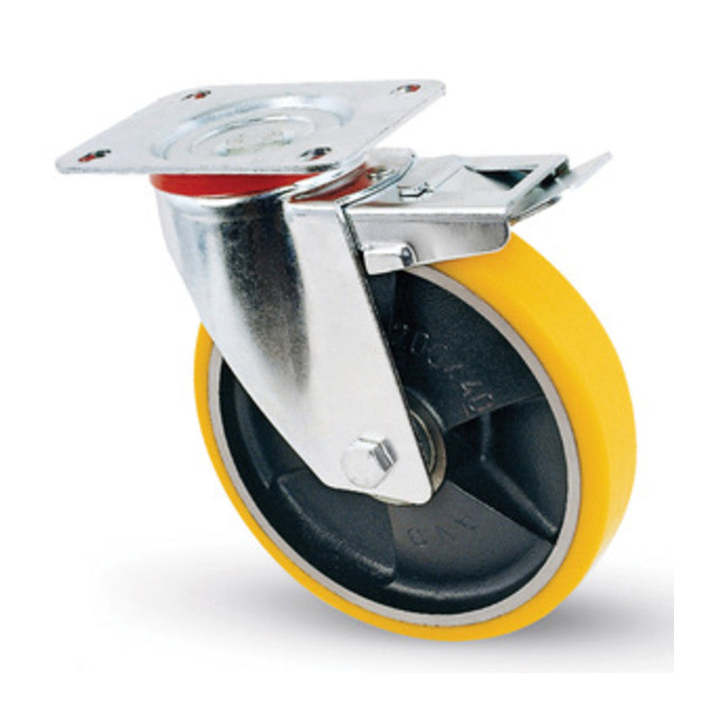Art. 24/ANT rivestita in poliuretano Avolan Sh A 91. Nucleo in ghisa meccanica verniciata nero. Mozzo su cuscinetti a sfere schermati. Supporto in acciaio stampato con piastra girevole 100 x 85 mm. Con freno. Dimensioni 80 x 20 x h 108 mm. Portata max 120 kg.