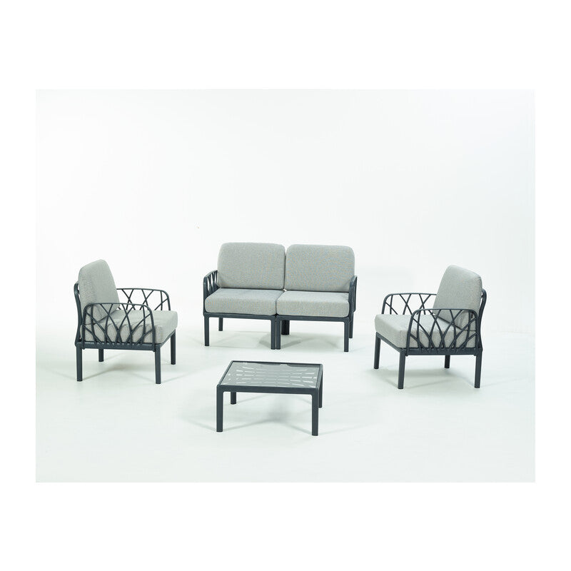 struttura in polipropilene rinforzato in fiblerglass. Antistatico, resistente ai raggi UV. Composta da 1 divano 2 posti cm 140x75x78h2 poltrone cm 71,5x75x78h1 tavolino cm 75x62,5x37hColore antracite con cuscini grigio melange