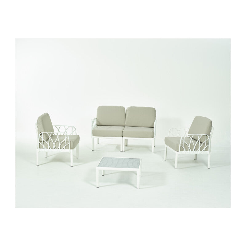 struttura in polipropilene rinforzato in fiblerglass. Antistatico, resistente ai raggi UV. Composta da 1 divano 2 posti cm 140x75x78h2 poltrone cm 71,5x75x78h1 tavolino cm 75x62,5x37hColore bianco con cuscini beige