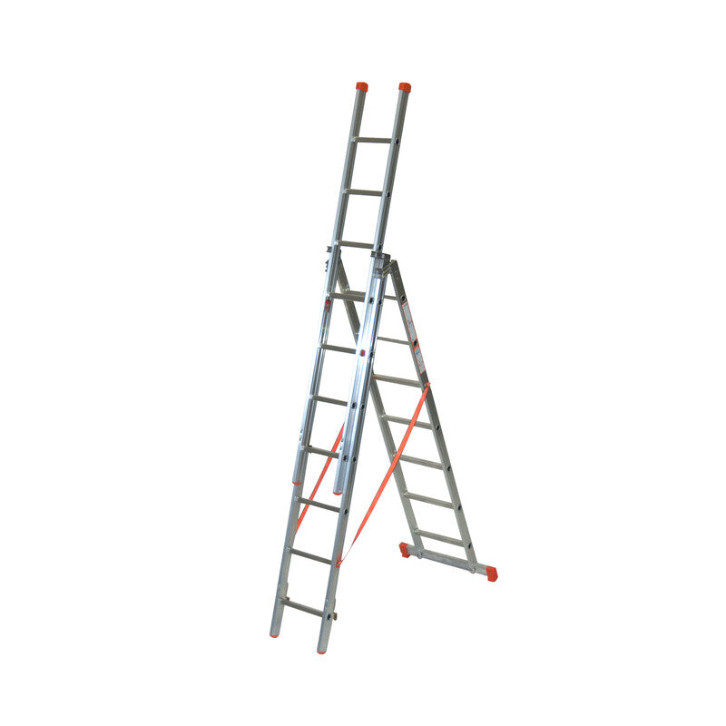 Mod. Genia 7+7+7 scalini tutta in alluminio una scala europea trasformabile a tre rampe. Indicata sia ad utenza professionale con uso intensivo, che privata. Cerniere ad alta resistenza in alluminio fuso fissate con viti. Utilizzabile sia a sfilo che in apertura a cavalletto. Sezione montanti 25x65 mm. Chiusa h 233 cm. Massima estensione aperta a sfilo 502 cm. Aperta a cavalletto 148 x h 223 cm. Peso 16 kg.