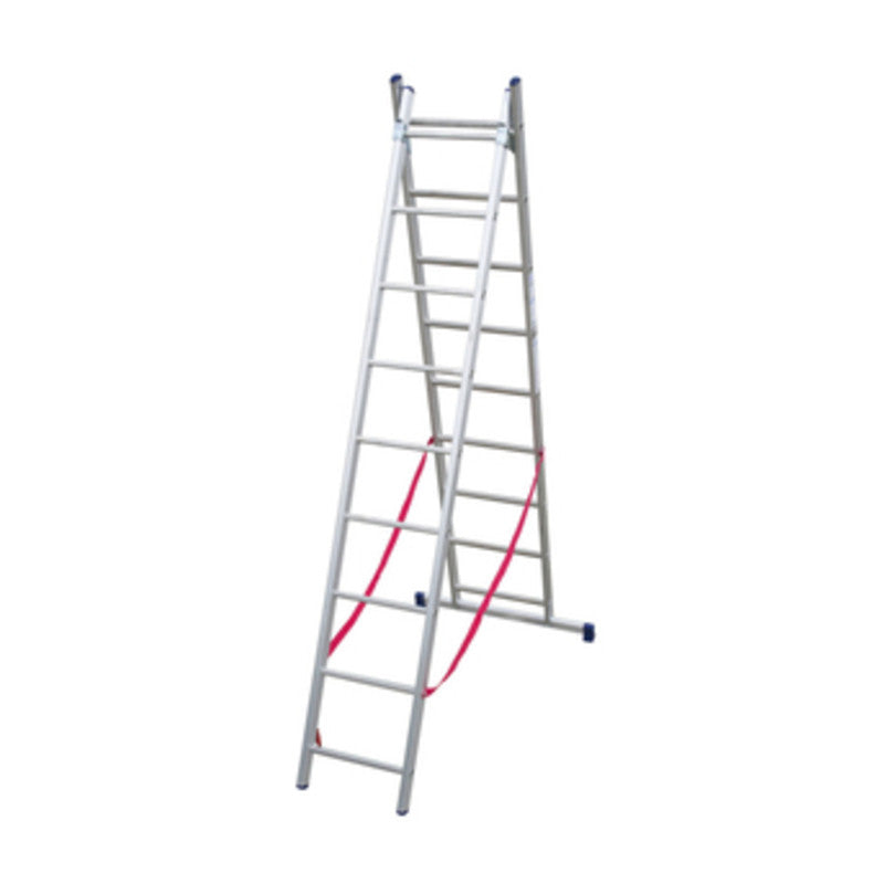 Mod. Stilo in alluminio 9+9 gradini con articolazioni in acciaio a due rampe indicate sia per operatori professionali che privati. Trasformabile da appoggio, a cavalletto o a sfilo. Le forti cerniere dacciaio si agganciano ai gradini e permettono lapertura della scala a cavallletto anche zoppa. Sezione montanti 65 x 25 mm. Gradini 24 x 24 mm. A norme europee EN 131. Munita di cinghie di sicurezza e barra stabilizzatrice 89 cm. Altezza min/max a sfilo chiusa e aperta 258/426 cm. Larghezza base 47,8 cm, secondo elemento 41,4 cm. Altezza di lavoro utile a cavalletto 337 cm a sfilo 516 cm. Dimensioni a cavalletto 89 x 169 x h 247 cm. Portata max 150 kg. Peso 11,0 Kg.