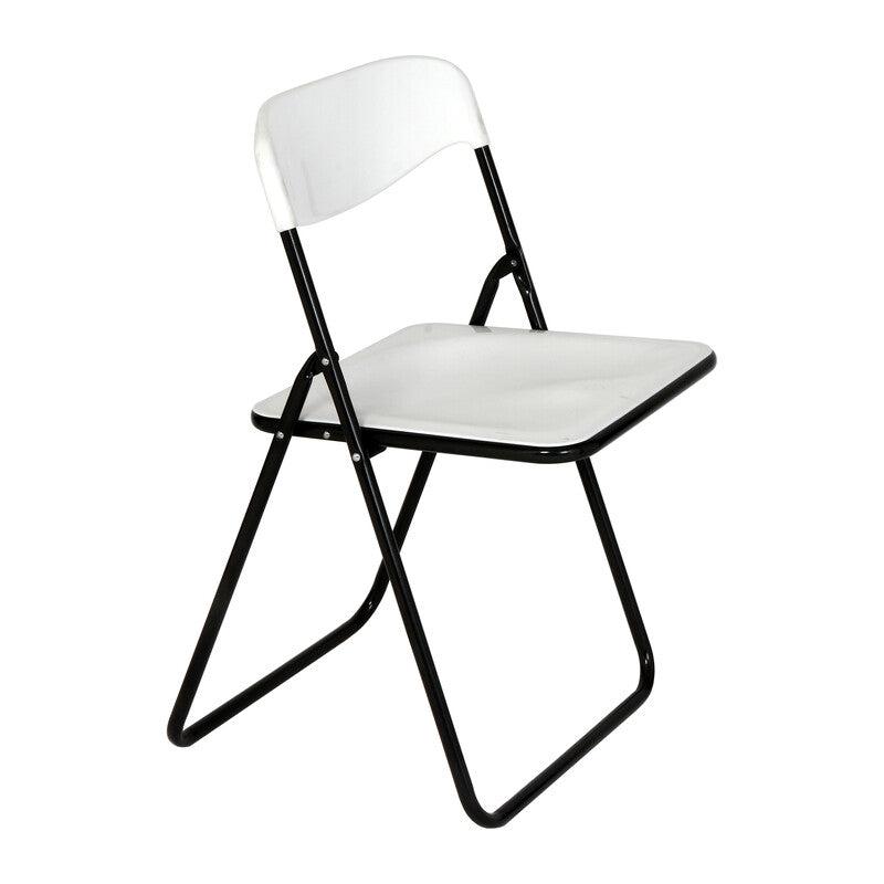 Sedile e schienale in plastica con telaio in metallo tondo diametro 18 mm verniciato nero. Dimensioni aperta 46 x 50 x h 80 cm, chiusa 47 x 17 x h 92 cm. Peso 2,8 kg.