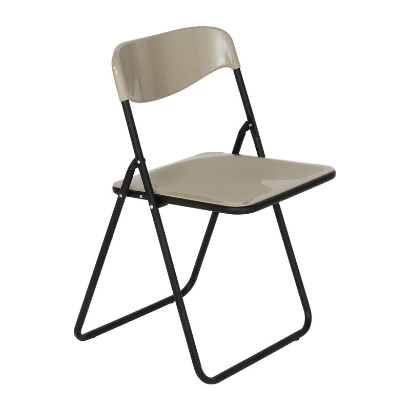 Sedile e schienale in plastica con telaio in metallo tondo diametro 18 mm verniciato nero. Dimensioni aperta 46 x 50 x h 80 cm, chiusa 47 x 17 x h 92 cm. Peso 2,8 kg.