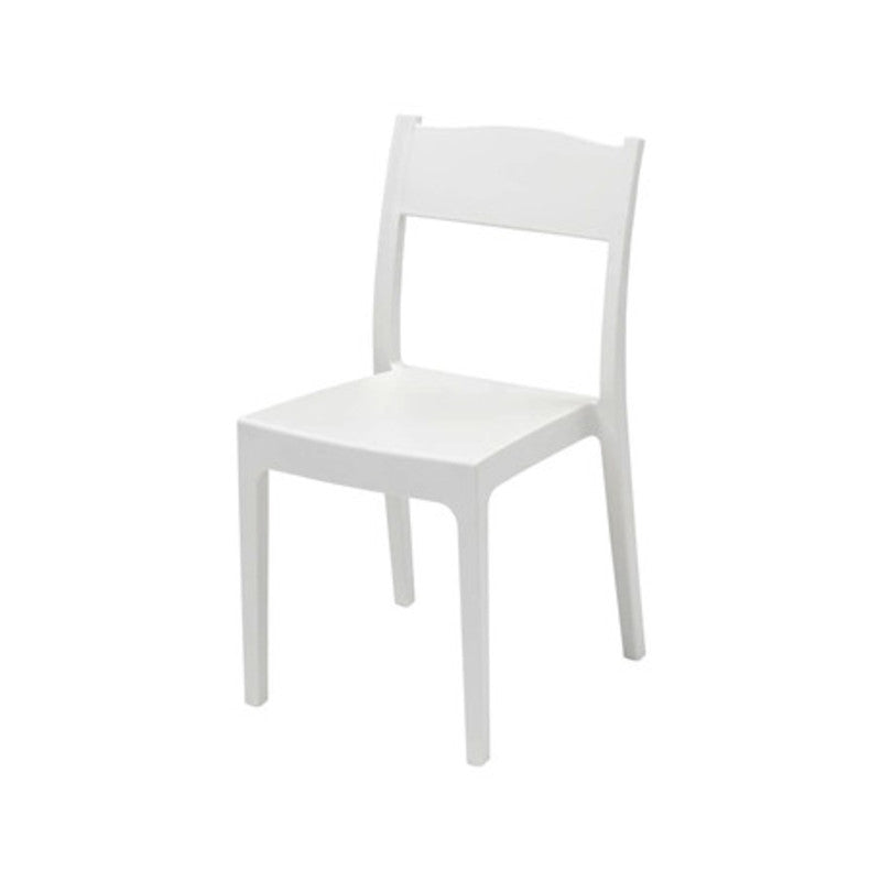 Sedia da esterno in polipropilene . Impilabile. Certificata Catas per uso professionale come bar, pub, ristorante, pizzeria o albergo. Dimensioni 41 x 41 x h 83 cm. Colore bianco