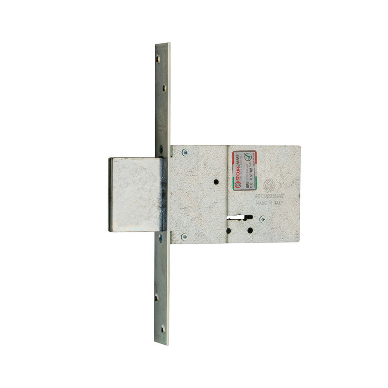 Serratura infilare a doppia mappa di altissima sicurezza per serramenti e cancelletti, chiusure laterali. Dotata di brevetti contro la manipolazione. Entrata 70 mm, lunghezza 80 mm, 1 punto di chiusura, 2 mandate. Corsa catenaccio 40 mm. Dotazione 1 contropiastra CP2001XZB e 2 piastrine 4901XZB. Dimensioni 25x220 mm. Peso 813 g.