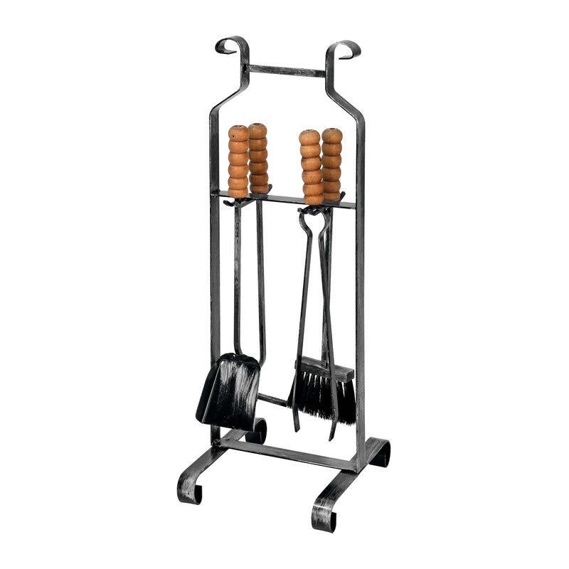 4 accessori per camino in acciaio verniciato, appesi su un supporto composto da 1 spazzola, 1 paletta, 1 pinza e 1 attizzatoio con impugnatura in legno. Stabile e sicuro grazie ai 4 piedi. Dimensioni 26xh 70 cm