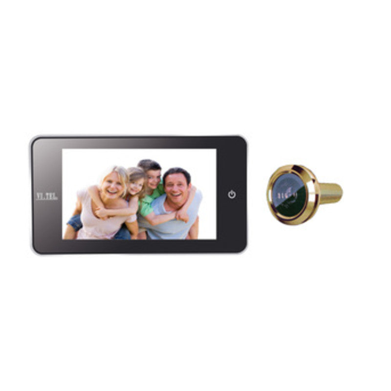 Installabile su porte con spessore 38110 mm. Foro porta da 1422 mm. Sensore CMOS 0,3 megapixel. Schermo LCD TFT da 4,3. Dimensioni 139 x 16 x h 77 mm. Attacco piattina FLAG. Angolo visuale 110. Alimentazione 4 batterie stilo AAA. Accensione manuale. Spegnimento automatico dopo 10 secondi. Finitura oro. Peso 290 g.