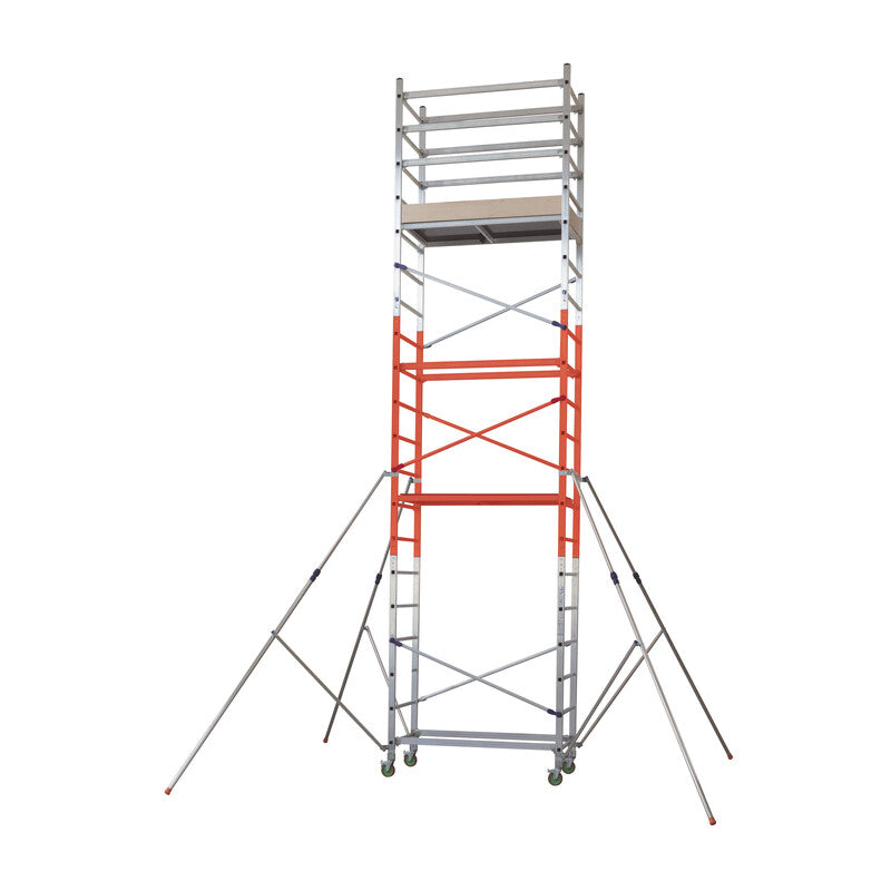 2 spalle base 6 gradini 4 ruote con freno, 2 diagonali, 2 traverse di base, 1 piano con botola altezza 6,20 m. Peso 86 kg.