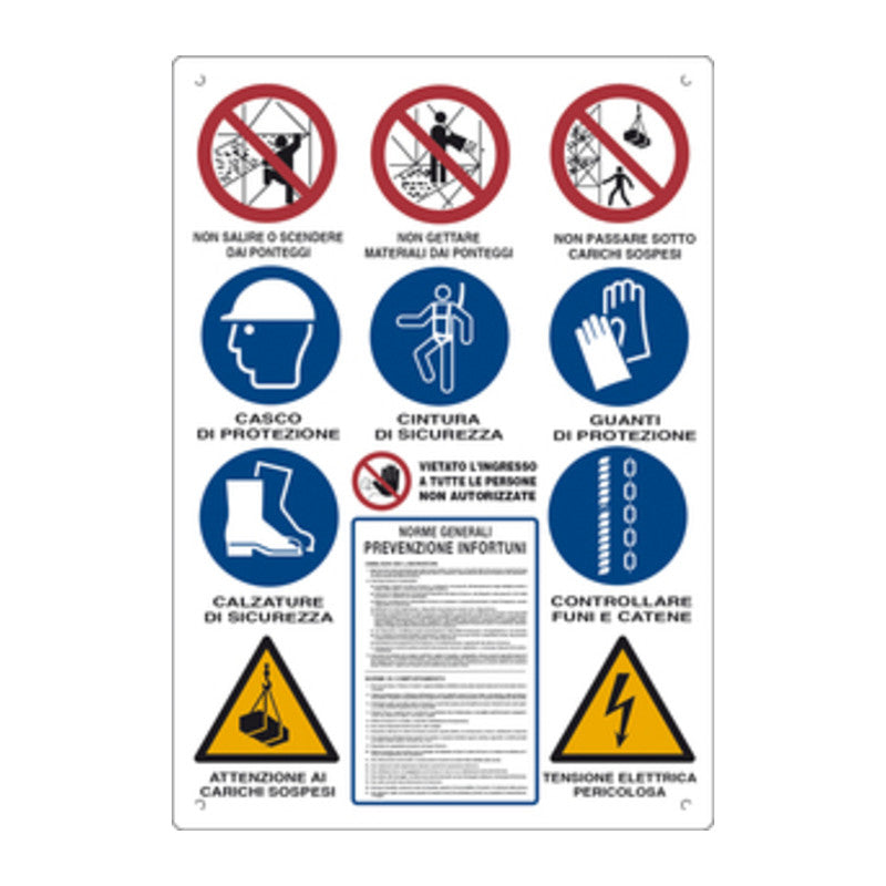 gruppo di 12 norme anti infortunistiche. Supporto in polionda bianco con stampa a 4 colori. Dimensioni 80 x 60 cm.