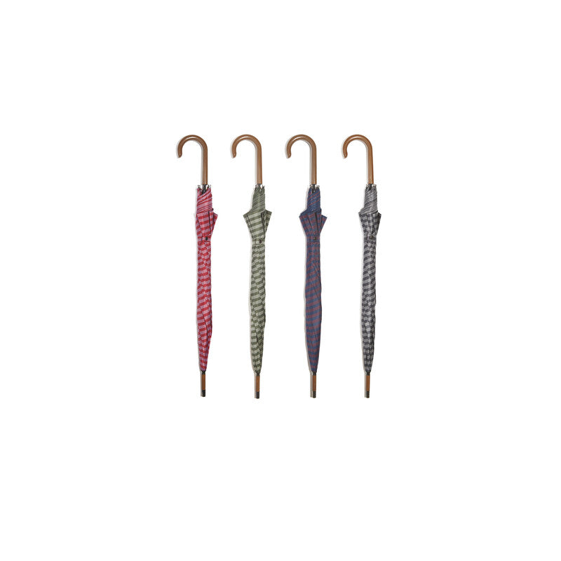 Ombrello lungo con apertura automatica della linea Qui non ci piove aste in fibra di vetro. Tessuto nylon. Impugnatura chiara. Diametro 114 cm aperto, chiuso h 92 cm.