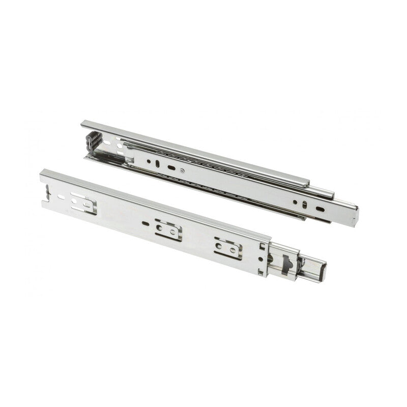 in acciaio zincato lucido. A estrazione totale. Scorrimento su sfere di acciaio. Fissaggio laterale. Portata 30 kg Lunghezza 35 cm