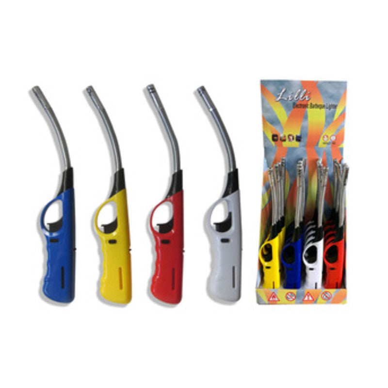 ricaricabile con chiusura di sicurezza. Il suo tubo flessibile permette di tenere le mani lontano dalla fonte di calore per una maggiore sicurezza. Grip pollice antiscivolo. Fiamma regolabile. Serbatoio trasparente per livello gas. Foro per appenderlo. Colori assortiti. Dimensioni h 28 cm