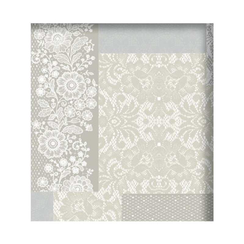 PVC stampato accoppiato a tessuto di polipropilene. Altezza 140 cm. Fantasia Quadretti pizzo grigio. Rotolo da 20 m.