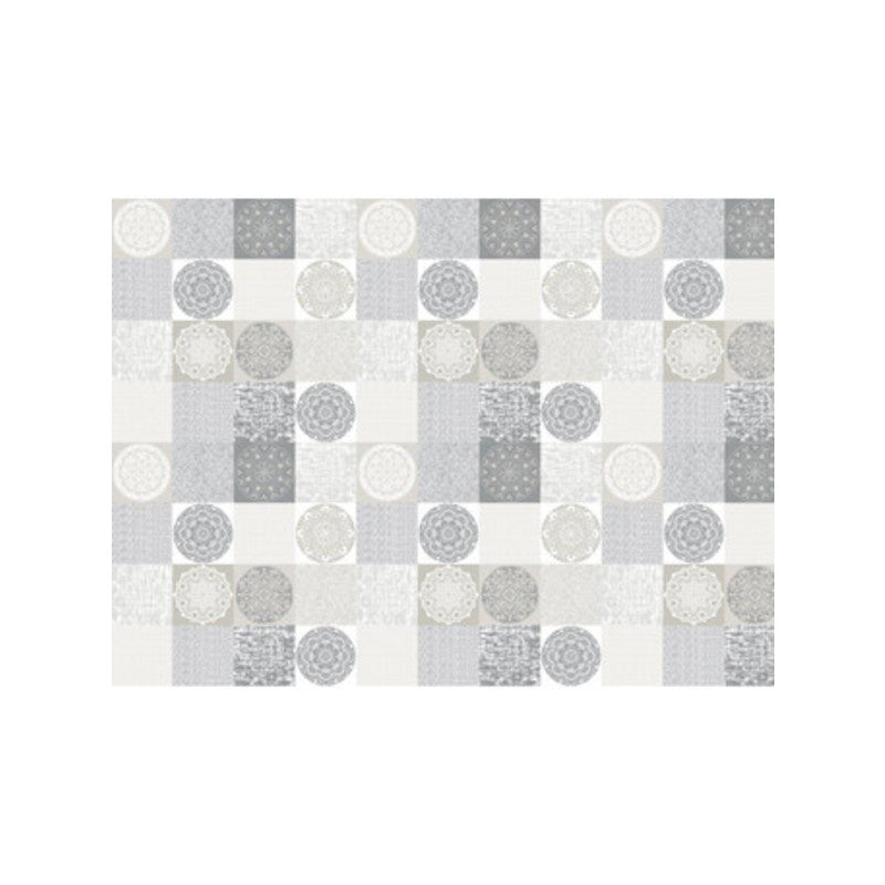 PVC stampato accoppiato a tessuto di polipropilene. Altezza 140 cm. Fantasia Quadretti e tondi grigio. Rotolo da 20 m.