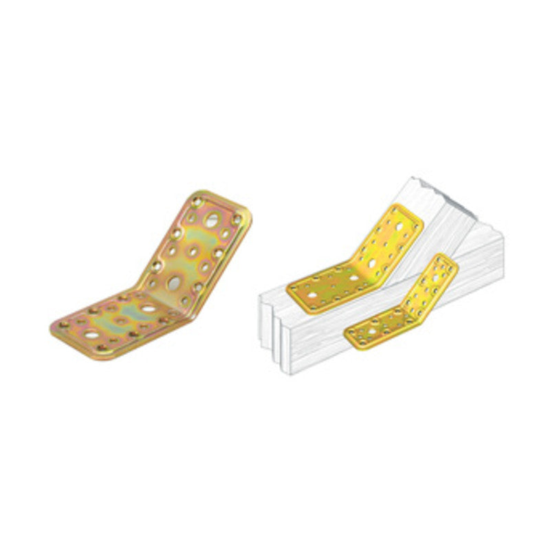 Art. 760 giunzione ad angolo da 135, modello pesante. Realizzata in acciaio tropicalizzato per fissare pannelli e grigliati in legno. Dimensioni 65 x 90 x 90 mm. Spessore 2,2 mm. Peso 210 g.