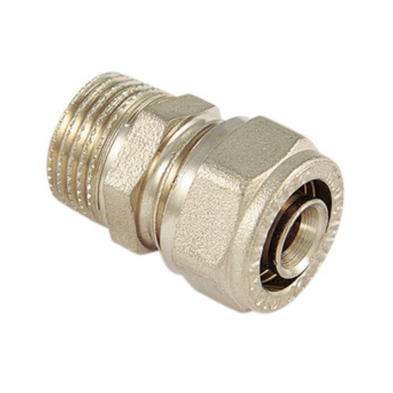 in ottone nichelato. A stringere. Per tubi multistrato, pressione max di esercizio 10 bar. Attacco maschio. Diametro 20x mm. Temperatura di esercizio max 95 C - min -20 C.