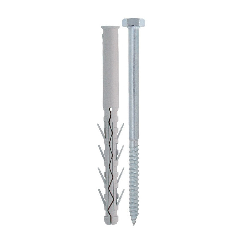 prolungato in nylon (poliammide) ad elevata espansione con 4 alette. Completo di vite testa esagonale. Diametro 10 mm. Lunghezza 160 mm.
