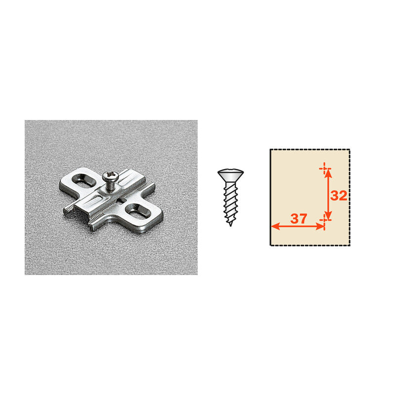 Base simmetrice a croce per sportelli di mobili e cucine. Per cerniere Serie 100, 200, 400, 600, 800, 900, F, M,cerniere universali e Silentia+. Foratura 37x32 mm atezza collo 6 mm. Regolazione verticale 2 mm. Base in acciaio. Fissaggio vite legno.
