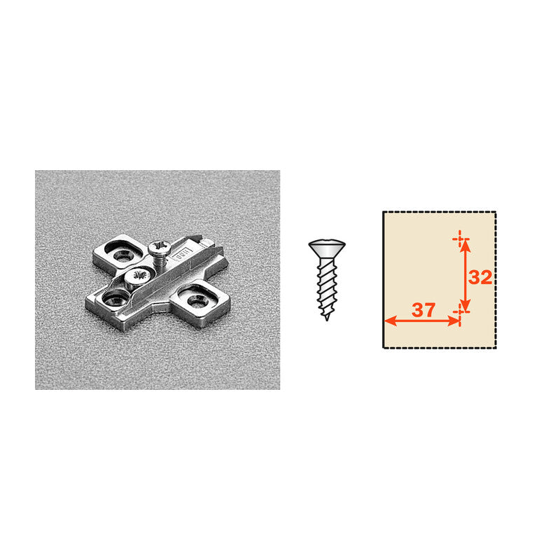 Per cerniere Serie 100, 200, 400, 600, 900, F, M, cerniere universali e Silentia+ - Base longitudinale e a croce collo 6. - Regolazione verticale 2 mm mediante eccentrico. Base in zama. Fissaggio vite legno. Dimensioni 32x37 mm.