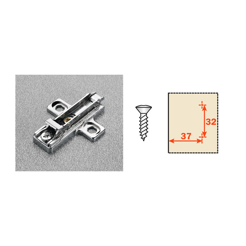 base Domi a croce a innesto rapido. Per cerniere Serie 100, 200, 400, F, M, cerniere universali e Silentia+. Foratura 37x32 mm. Altezza 0 mm. Regolazione frontale e verticale mediante eccentrico. Base in zama. Fissaggio vite legno.