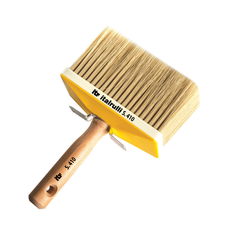 in setola sintetica conica bionda, assicella in plastica bicolore e manico in legno. Disposizione delle setole a ciuffetti e incrociati. Ideale per idropitture e tutti i tipi di vernice. Altezza 83 mm. Dimensioni 50x150 mm.