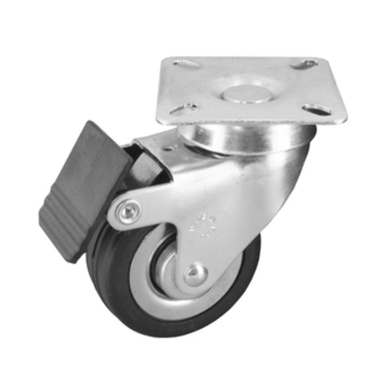 Art. 160 bisbrin gomma. Supporto rotante su doppia corona di sfere a piastra in acciaio 60 x 60 mm, zinco cromato. Con dispositivo di bloccaggio ruota. Diametro 60 x 24 x h 88 mm. Portata 50 kg.